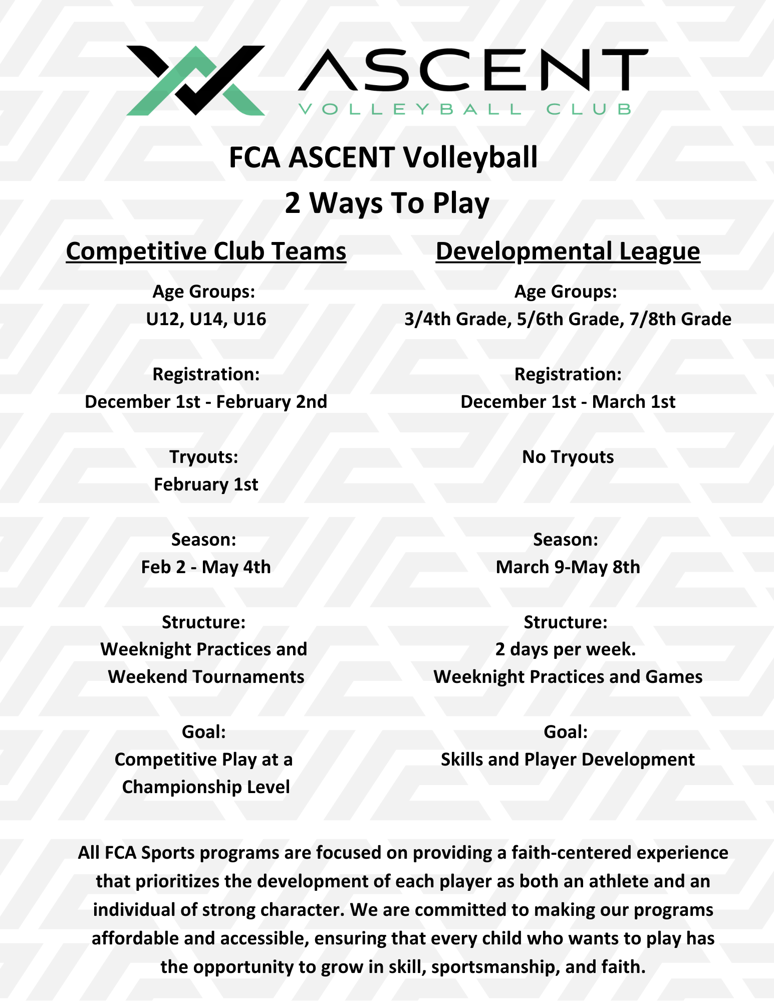 Our ASCENT club teams compete at a high level while staying rooted in FCA Sports’ values of integrity, serving, teamwork, and excellence . Coaches lead with intentionality, focusing on both athletic and personal development as they guide players through a season marked by growth, challenge, and community.