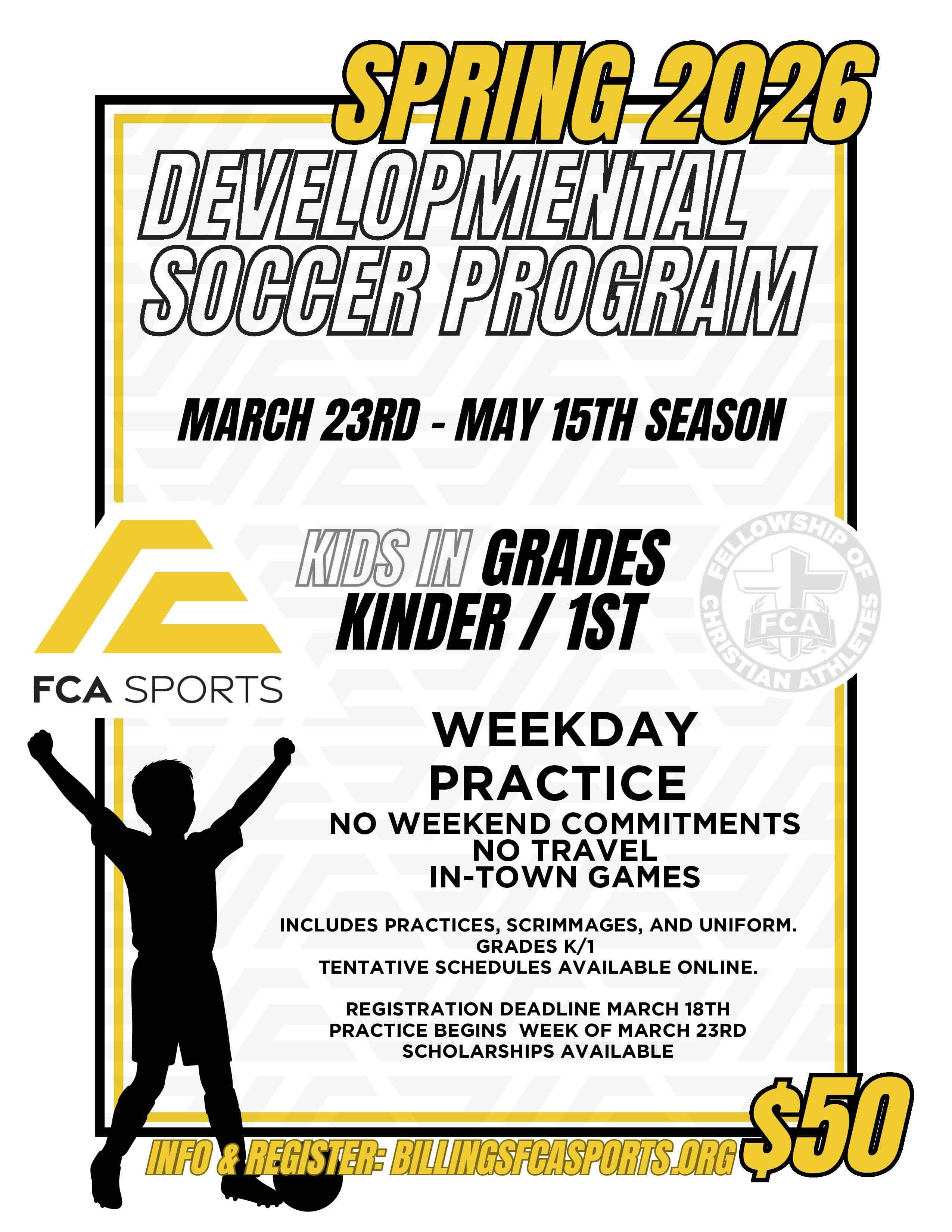 FCA Sports Soccer in Billings provides an exceptional youth sports experience where every athlete—no matter their background—can grow in skill, confidence, character, and community. Our coaches are committed to creating a positive, encouraging environment where players feel valued and supported as they develop both on and off the field.